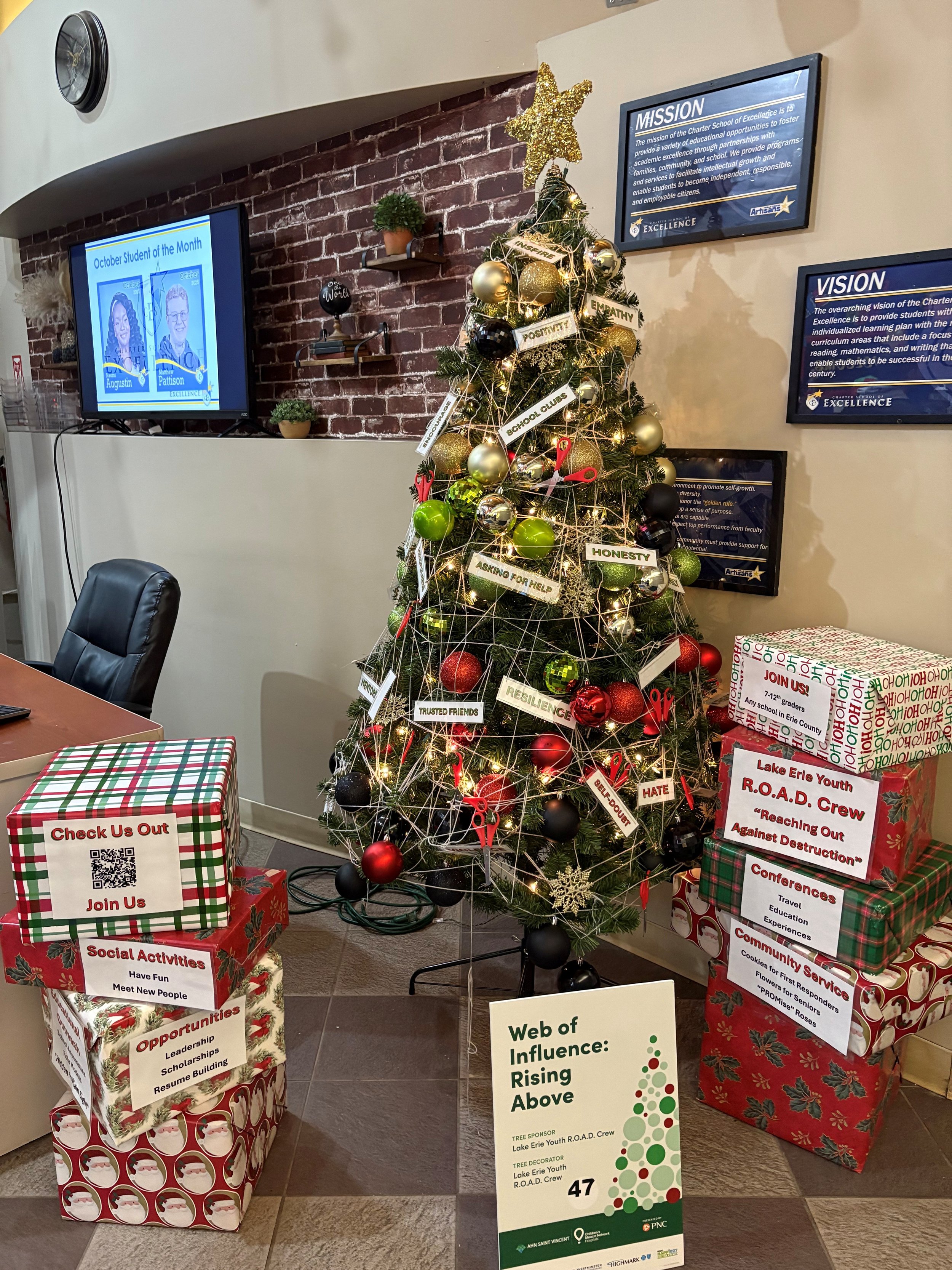 Participated in AHN Festival of Trees in November. Our tree was symbolic and called "Web of Influence - Rising Above" We donated the tree to Charter School of Excellence. Plan to decorate one again next year and donate to another school to share our message!